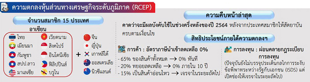 ความตกลงหุ้นส่วนทางเศรษฐกิจระดับภูมิภาค (Regional Comprehensive Economic Partnership : RCEP) กรอบความร่วมมือทางเศรษฐกิจที่ใหญ่ที่สุดในโลกที่ครอบคลุมทั้งมิติการค้าและการลงทุน ไม่ว่าจะเป็นการลดอัตราภาษีนำเข้าและข้อจำกัดทางการค้าอื่น ๆ ระหว่างประเทศสมาชิก ตลอดจนมาตรการส่งเสริมการลงทุนต่าง ๆ อันจะนำมาซึ่งโอกาสทางการค้าและการลงทุนสำหรับผู้ประกอบการไทยในการขยายตลาดสู่เวทีโลกทั้งทางตรงและทางอ้อม
