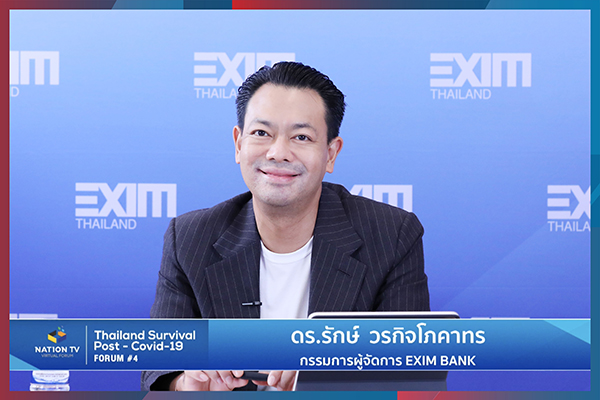 ดร.รักษ์ วรกิจโภคาทร กรรมการผู้จัดการ EXIM BANK ร่วมเป็นวิทยากรบรรยายเกี่ยวกับแนวทางสนับสนุนให้ผู้ประกอบการไทย โดยเฉพาะ SMEs เช็กสถานะทางธุรกิจและบริหารการเงินอย่างยั่งยืน โดย EXIM BANK มีบริการสินเชื่อ ประกันการส่งออก พร้อมคำปรึกษาแนะนำ เพื่อช่วยให้ SMEs สามารถปรับตัวรับมือกับการเปลี่ยนแปลงของโลกในยุค Next Normal หลังสถานการณ์การแพร่ระบาด COVID-19 คลี่คลาย ได้อย่างมั่นคงและยั่งยืน ในงานสัมมนา Thailand Survival Post COVID-19 หัวข้อ “ฟื้นไข้ SMEs…ฝ่าวิกฤตโควิด” ช่วง “รักษาสภาพคล่อง SMEs” พร้อมกับนายวิทัย รัตนากร ผู้อำนวยการธนาคารออมสิน จัดโดย Nation TV ในรูปแบบ Virtual Forum เมื่อเร็ว ๆ นี้ |
