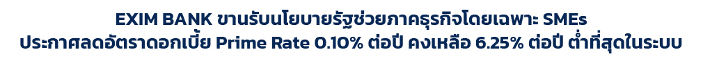 การปรับลดอัตราดอกเบี้ย Prime Rate ในครั้งนี้เป็นการขานรับนโยบายของรัฐบาล เพื่อช่วยเหลือและบรรเทาภาระหนี้และต้นทุนทางธุรกิจให้แก่ผู้ประกอบการโดยเฉพาะกลุ่ม SMEs อย่างต่อเนื่อง สอดคล้องกับภารกิจของ EXIM BANK ในการสนับสนุนผู้ประกอบการไทยให้มีสภาพคล่องในการดำเนินธุรกิจ สามารถปรับตัวรับมือปัจจัยท้าทายและแข่งขันได้ในเวทีการค้าโลกอย่างยั่งยืน ในสภาวะที่เศรษฐกิจไทยเติบโตในอัตราที่ช้าลง และความเสี่ยงที่เพิ่มขึ้นจากนโยบายการค้าของประเทศเศรษฐกิจหลัก