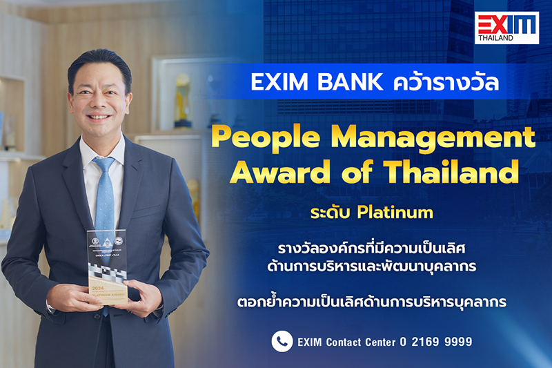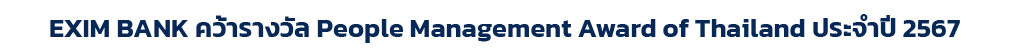 ดร.รักษ์ วรกิจโภคาทร กรรมการผู้จัดการ EXIM BANK รับรางวัล People Management Award of Thailand ประจำปี 2567 ระดับ Platinum (ระดับสูงสุด) ในงาน Thailand People Management and Well-being Forum: Award Ceremony & Best Practices Sharing จัดโดยสมาคมการจัดการงานบุคคลแห่งประเทศไทย (PMAT) ร่วมกับคณะแพทยศาสตร์ จุฬาลงกรณ์มหาวิทยาลัย สมาคมบริษัทจดทะเบียนไทย และชมรม Human Capital Management Club เพื่อเชิดชูองค์กรที่มีความเป็นเลิศในการบริหารและพัฒนาทรัพยากรมนุษย์ รวมถึงส่งเสริมวัฒนธรรมองค์กรที่ใส่ใจด้าน Well-being อย่างแท้จริง นับเป็นความสำเร็จของ EXIM BANK ในการบริหารจัดการทรัพยากรบุคคลซึ่งเป็นทรัพยากรที่มีค่าที่สุด เพื่อสร้างสังคมการทำงานที่มีคุณภาพและดูแลเอาใจใส่ความเป็นอยู่ของบุคลากรแบบองค์รวมโดยแท้จริง ณ โรงแรมดุสิตธานี กรุงเทพฯ เมื่อเร็ว ๆ นี้