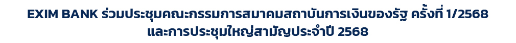 ดร.เบญจรงค์ สุวรรณคีรี รองกรรมการผู้จัดการ EXIM BANK พร้อมด้วยผู้บริหารจากสถาบันการเงินของรัฐ เข้าร่วมการประชุมคณะกรรมการสมาคมสถาบันการเงินของรัฐ ครั้งที่ 1/2568 และการประชุมใหญ่สามัญประจำปี 2568 จัดโดยสมาคมสถาบันการเงินของรัฐ (The Government Financial Institutions Association: GFA) เพื่อพิจารณารายงานผลการดำเนินงานของสมาคมฯ ในปี 2567 และทิศทางการดำเนินงานตามยุทธศาสตร์ของสมาคมสถาบันการเงินของรัฐ ปี 2568 โดยมีนายวิทัย รัตนากร ผู้อำนวยการธนาคารออมสิน เป็นประธาน ณ ธนาคารเพื่อการเกษตรและสหกรณ์การเกษตร สำนักงานใหญ่ เมื่อเร็ว ๆ นี้ |