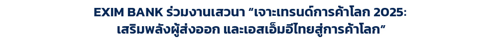 ดร.เบญจรงค์ สุวรรณคีรี รองกรรมการผู้จัดการ EXIM BANK ร่วมเสวนาหัวข้อ “Global Trends 2025: Opportunities for Growth and Expansion for Thai SMEs เจาะเทรนด์การค้าโลก 2025: โอกาสสำหรับการเติบโตของ SMEs ไทย” ในงาน “เจาะเทรนด์การค้าโลก 2025: เสริมพลังผู้ส่งออกและเอสเอ็มอีไทยสู่การค้าโลก” จัดโดยกรมส่งเสริมการค้าระหว่างประเทศ กระทรวงพาณิชย์ โดยแลกเปลี่ยนมุมมองเกี่ยวกับแนวทางการปรับตัวของผู้ประกอบการในสถานการณ์การค้าโลกที่ไม่แน่นอน การป้องกันความเสี่ยงทางการค้า พร้อมนำเสนอเครื่องมือทางการเงินแก่ผู้ประกอบการที่เป็นสมาชิกหรือเข้าร่วมกิจกรรม อาทิ สินเชื่อเพื่อการร่วมงานแสดงสินค้า (Trade Fair Financing) วงเงินกู้ระยะสั้น-กลางเพื่อร่วมงานแสดงสินค้า ลดอัตราดอกเบี้ยปีแรก 0.5% ต่อปี สินเชื่อเอ็กซิมเริ่มต้นส่งออก (EXIM First Step Export Financing) สินเชื่อหมุนเวียนก่อนและหลังส่งออก สูงสุด 10 ล้านบาท ลดอัตราดอกเบี้ยปีแรก 0.25% ต่อปี และบริการประกันส่งออก EXIM for Small Biz มอบกรมธรรม์ฟรี สำหรับผู้ลงทะเบียนเข้าร่วมสัมมนา รับประกันผู้ซื้อ 1 ราย วงเงินผู้ซื้อ 300,000 บาท เพื่อสนับสนุนให้ผู้ประกอบการไทยขยายตลาดสู่เวทีการค้าโลก ณ กระทรวงพาณิชย์ เมื่อเร็ว ๆ นี้ |
