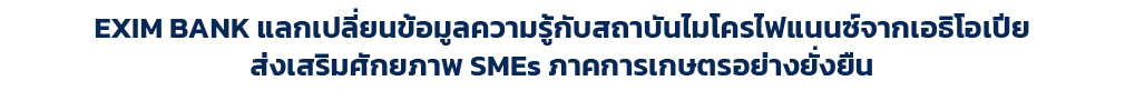 นางเศรษฐสุดา ตุลยธัญ ผู้ช่วยกรรมการผู้จัดการ EXIM BANK ให้การต้อนรับคณะผู้บริหารจากสถาบัน Liyu MFI สถาบัน Meklit MFI สถาบัน Dire MFI สถาบัน Peace MFI SC และสถาบัน AEMFI สถาบันไมโครไฟแนนซ์จากประเทศเอธิโอเปียที่เป็นสมาชิกสมาคมสินเชื่อการเกษตรและชนบทแห่งภาคพื้นเอเชียและแปซิฟิก (Asia-Pacific Rural and Agricultural Credit Association: APRACA) ในโอกาสเดินทางมาศึกษาดูงาน พร้อมบรรยายหัวข้อ “Linking Thai SME Products with the International Market through Export Finance” แลกเปลี่ยนประสบการณ์ของ EXIM BANK ในการส่งเสริมศักยภาพผู้ประกอบการ SMEs ภาคการเกษตรของไทยให้แข่งขันได้ในตลาดโลก มีคุณภาพชีวิตที่ดี นำไปสู่การพัฒนาอย่างยั่งยืน ณ EXIM BANK สำนักงานใหญ่ เมื่อเร็ว ๆ นี้ |