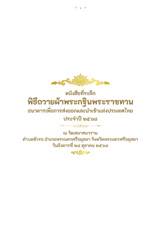 1 หนงสือที่ระลึก ั ิ พิธถวายผ้าพระกฐนพระราชทาน ี ธนาคารเพื่อการส่งออกและนาเข้าแห่งประเทศไทย ํ ํ ประจาปี ๒๕๖๘ ณ วัดเสนาสนาราม ี ั ตําบลหัวรอ อําเภอพระนครศรอยุธยา จงหวัดพระนครศรอยุธยา ี วันอังคารที่ ๒๘ ตุลาคม ๒๕๖๘