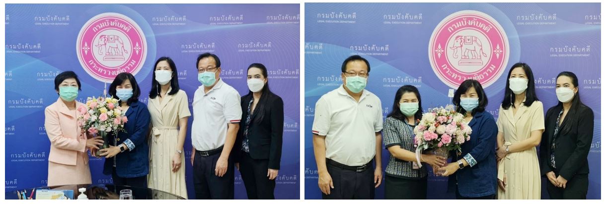 นางวันเพ็ญ อรรชุนเดชะ และนางสาวศนิสา พลังตระกูล ผู้ช่วยกรรมการผู้จัดการ ธนาคารเพื่อการส่งออกและนำเข้าแห่งประเทศไทย (EXIM BANK) ร่วมแสดงความยินดีกับนางทัศนีย์ เปาอินทร์ (ภาพซ้าย : ซ้ายสุด) อธิบดีกรมบังคับคดี และนางสุกัญญา บุษยนาวิน (ภาพขวา : ที่ 2 จากซ้าย) รองอธิบดีกรมบังคับคดี ในโอกาสเข้ารับตำแหน่งใหม่ พร้อมทั้งหารือแนวทางความร่วมมือระหว่าง EXIM BANK และกรมบังคับคดี ณ กรมบังคับคดี เมื่อวันที่ 20 มกราคม 2565