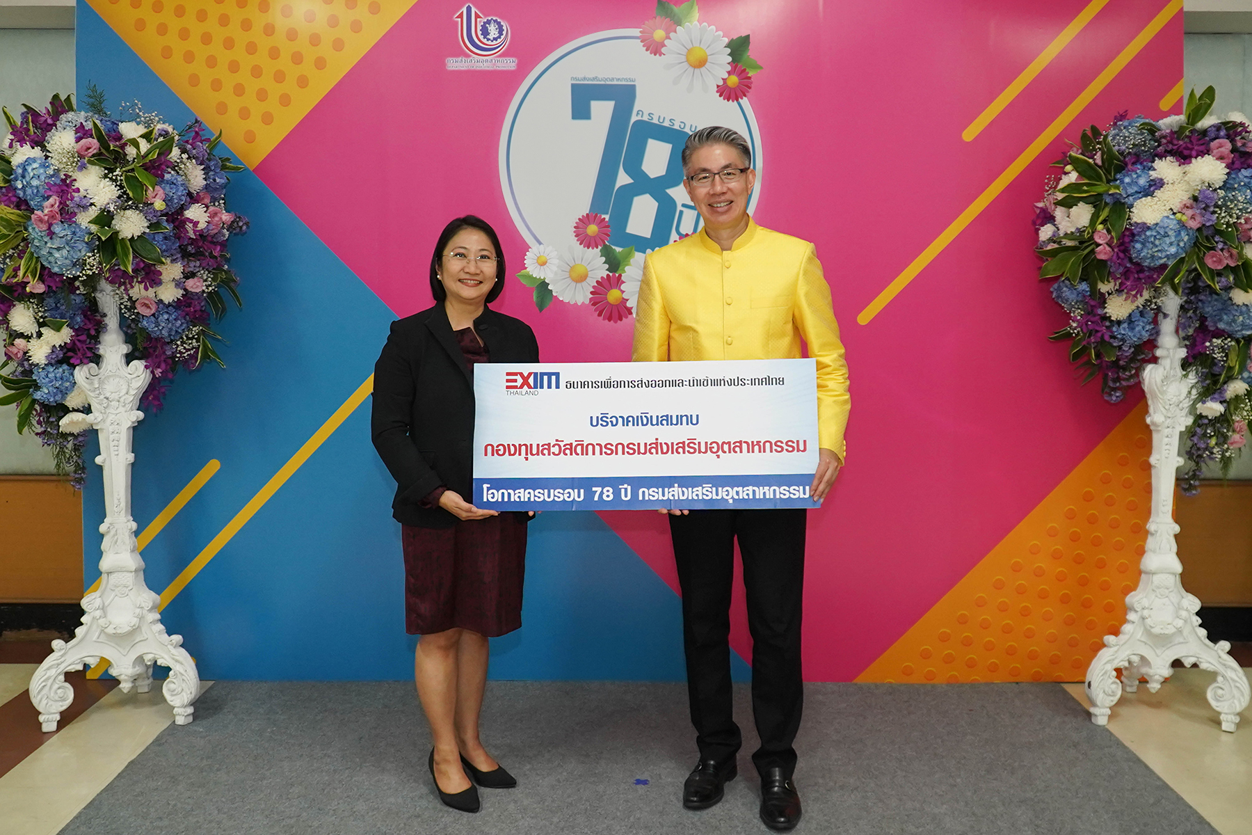 นางสาวดรัสวันต์ ชูวงษ์ (ซ้าย) ผู้ช่วยกรรมการผู้จัดการ ธนาคารเพื่อการส่งออกและนำเข้าแห่งประเทศไทย (EXIM BANK) ร่วมแสดงความยินดีกับ ดร.ณัฐพล รังสิตพล (ขวา) อธิบดีกรมส่งเสริมอุตสาหกรรม (กสอ.) กระทรวงอุตสาหกรรม พร้อมมอบเงินสมทบกองทุนสวัสดิการ กสอ. ในโอกาสวันคล้ายวันก่อตั้ง กสอ. ครบรอบ 78 ปี ณ กสอ. เมื่อวันที่ 11 มีนาคม 2563