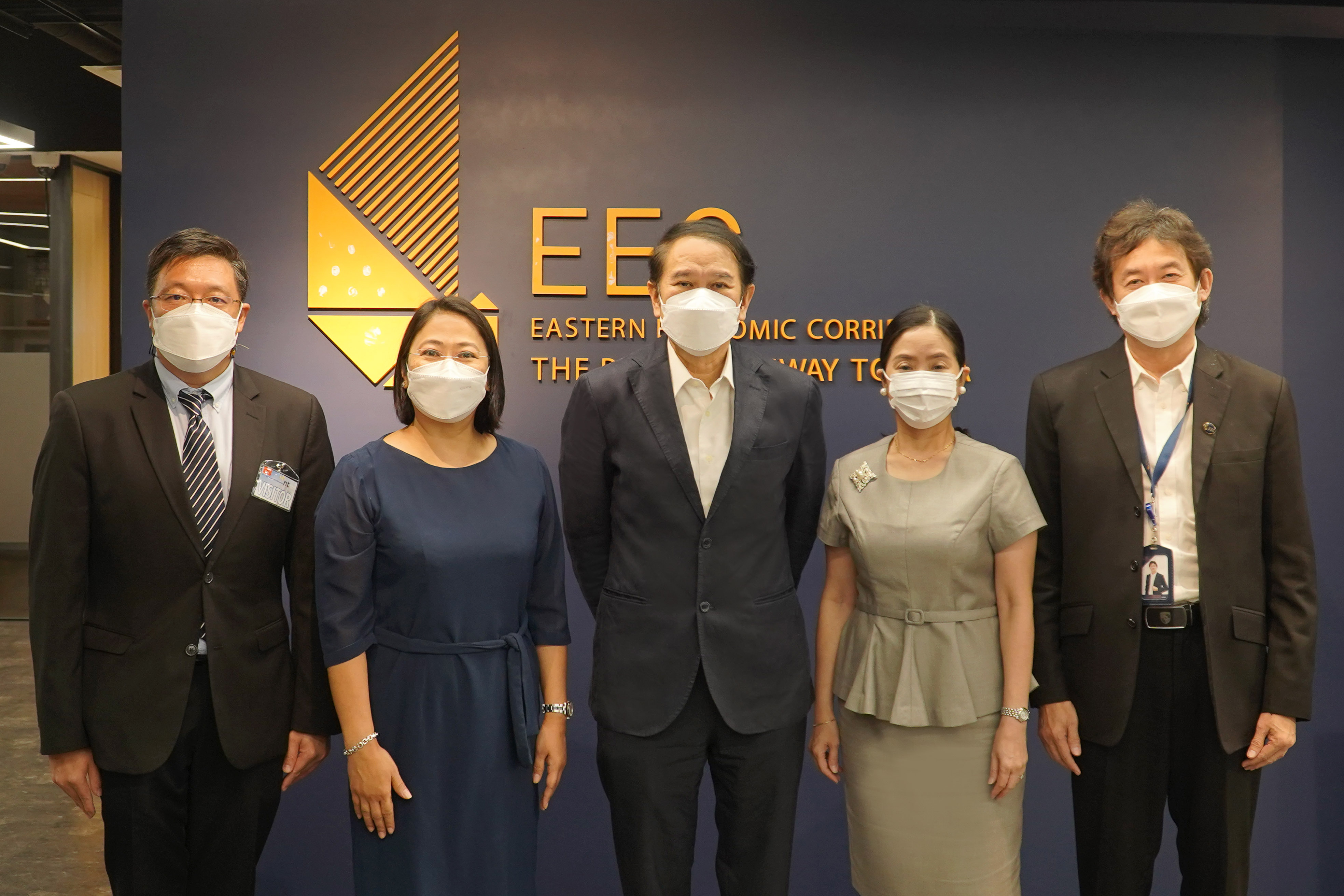 นางสาวดรัสวันต์ ชูวงษ์ (ที่ 2 จากซ้าย) ผู้ช่วยกรรมการผู้จัดการ ธนาคารเพื่อการส่งออกและนำเข้าแห่งประเทศไทย (EXIM BANK) เข้าพบ ดร.คณิศ แสงสุพรรณ (กลาง) เลขาธิการคณะกรรมการนโยบายเขตพัฒนาพิเศษภาคตะวันออก (สกพอ.) เนื่องในโอกาสปีใหม่ 2565 พร้อมทั้งหารือแนวทางเสริมสร้างความร่วมมือด้านการลงทุน นวัตกรรม และการพัฒนาเทคโนโลยีขั้นสูงในพื้นที่เขตพัฒนาพิเศษภาคตะวันออก (Eastern Economic Corridor : EEC) ณ สำนักงาน สกพอ. เมื่อวันที่ 11 มกราคม 2565